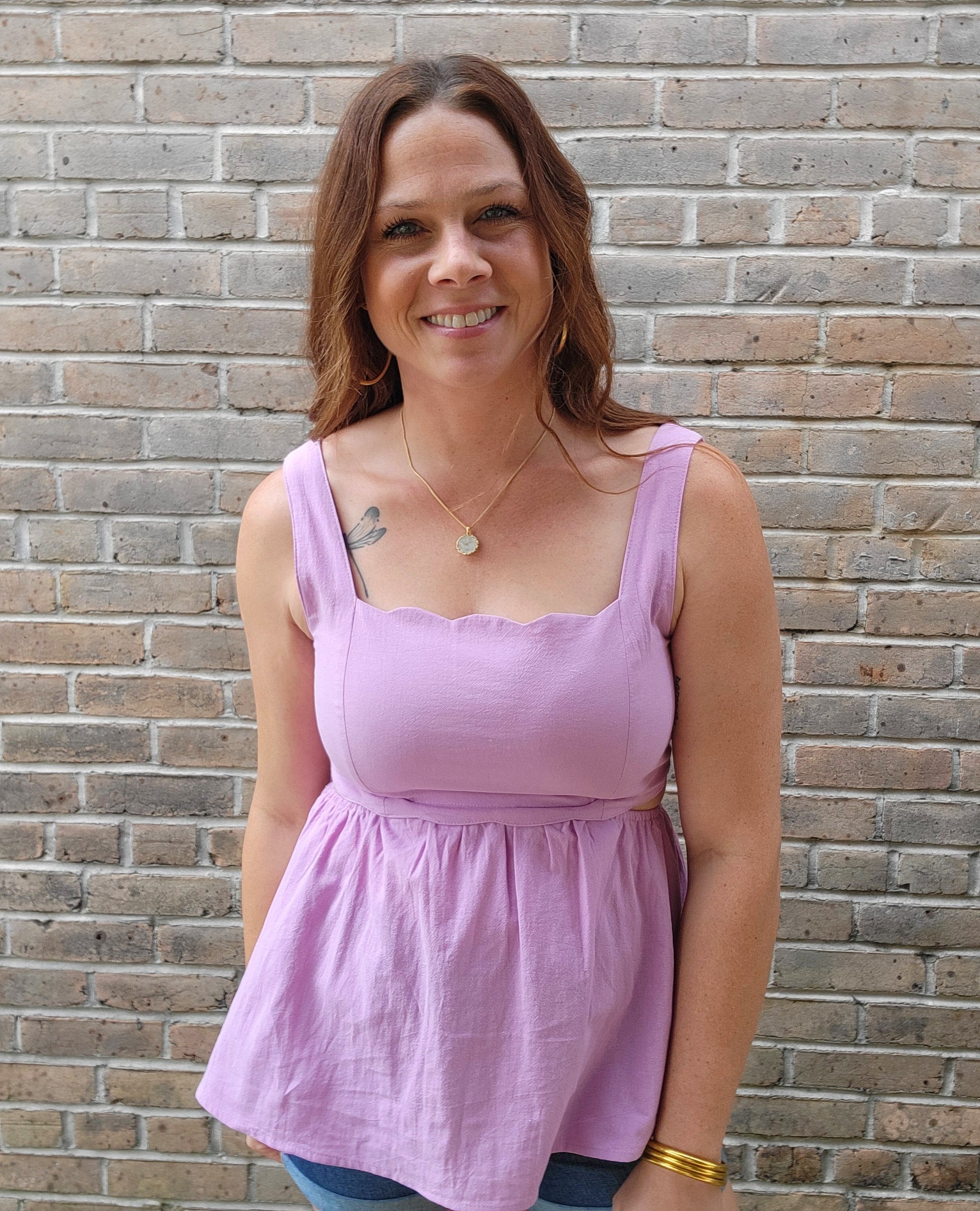 Introducing the Alba Tank Top, perfect for the modern woman who appreciates luxurious style. The square neck and cutout detail offer a bold and artistic touch, while the scalloped edges and smock back create a flattering fit. With an elastic waist to accentuate your curves, this top is a must-have for any fashion-forward wardrobe.