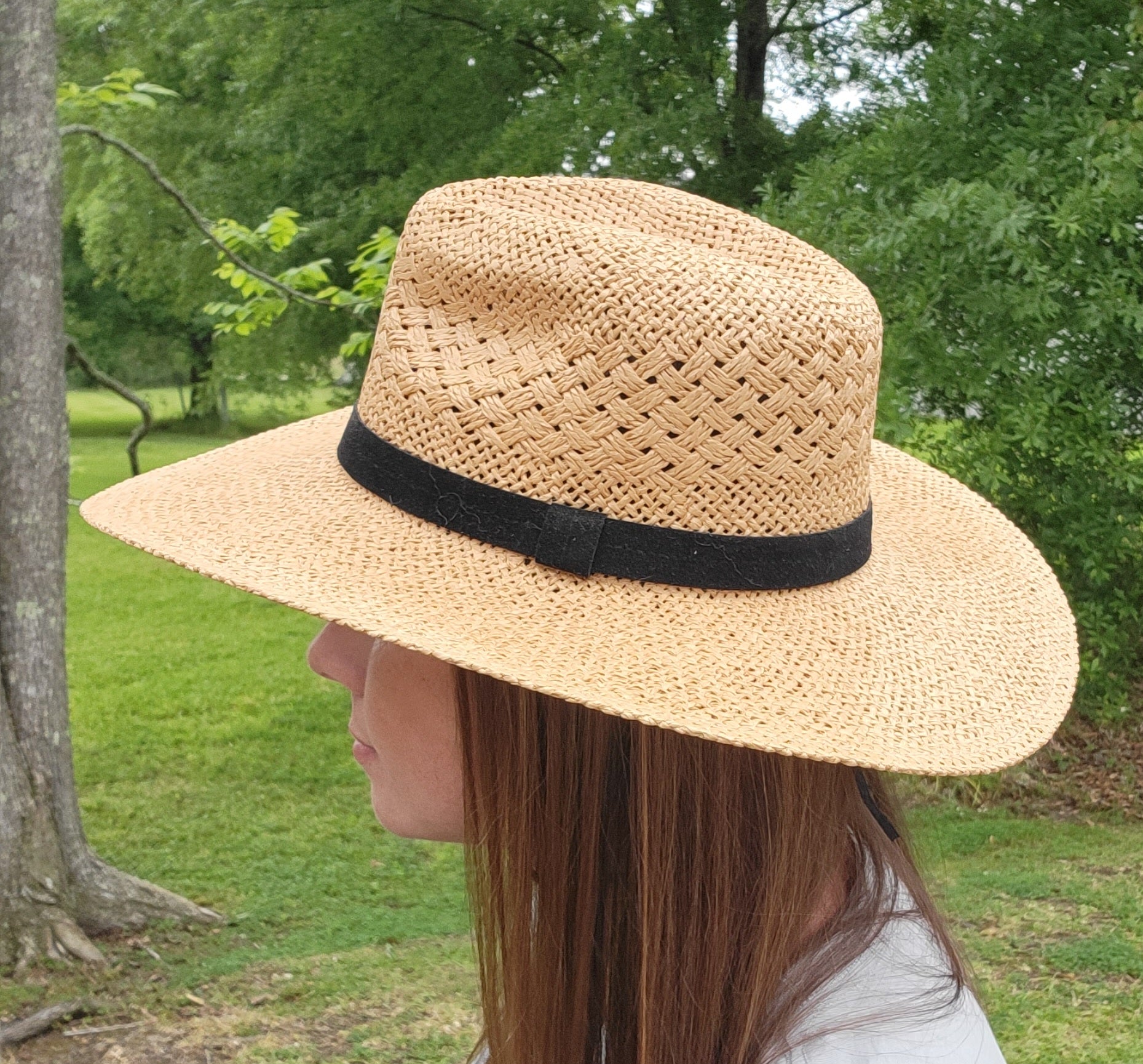 This Braided Fedora Sun Hat perfectly combines style and function! Crafted with a black ribbon, this hat provides excellent sun protection for all your beach adventures! Stylish and practical, it's a must-have for any summer wardrobe!