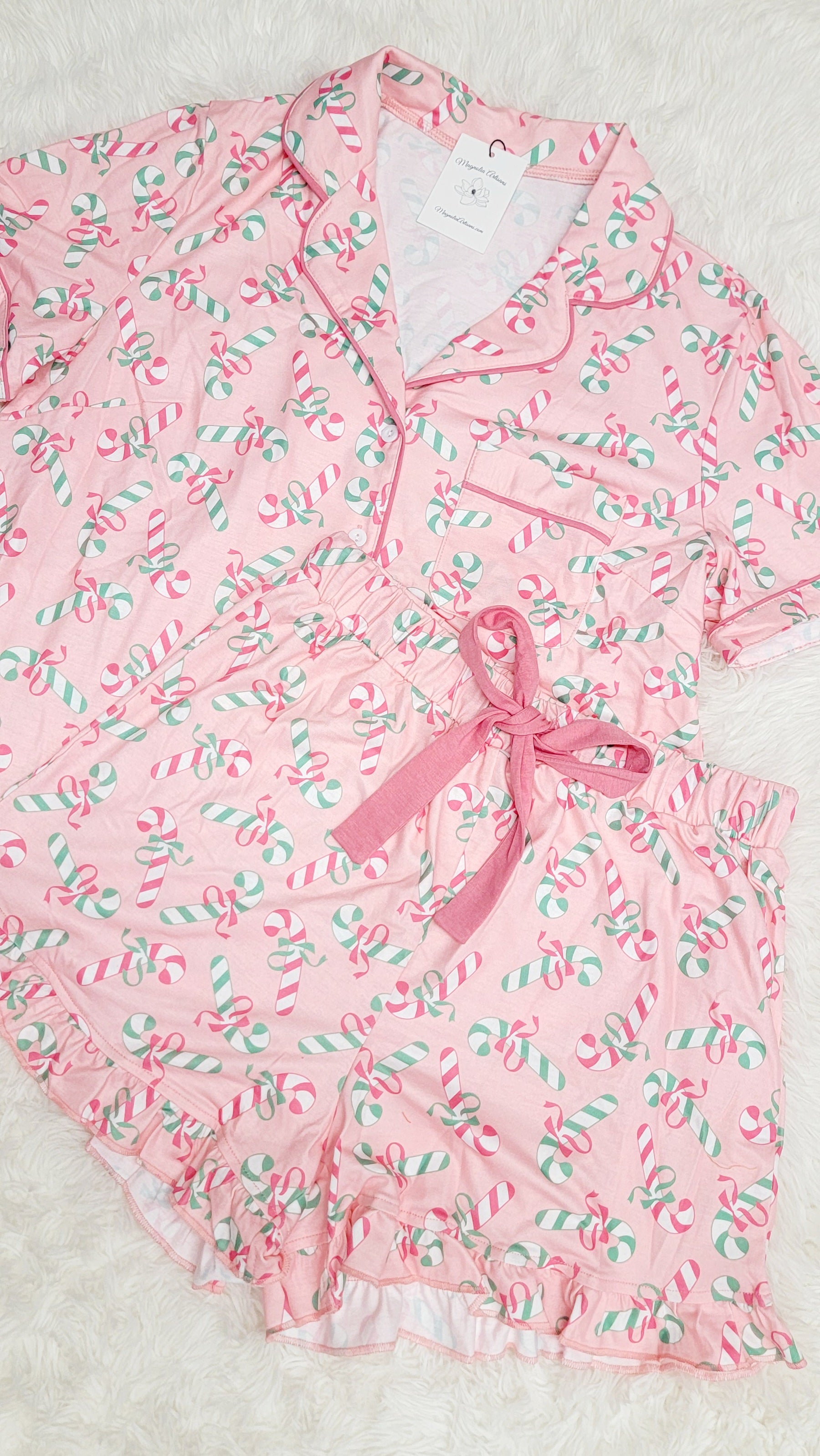 Get ready for cozy nights with our Candy Cane PJ Set! Featuring a playful light pink and green candy cane detail, this set is as sweet as it is soft. The elastic waist ensures a comfortable fit while the button down top adds a touch of whimsy. Sweet dreams await! Available in Pink & Red.