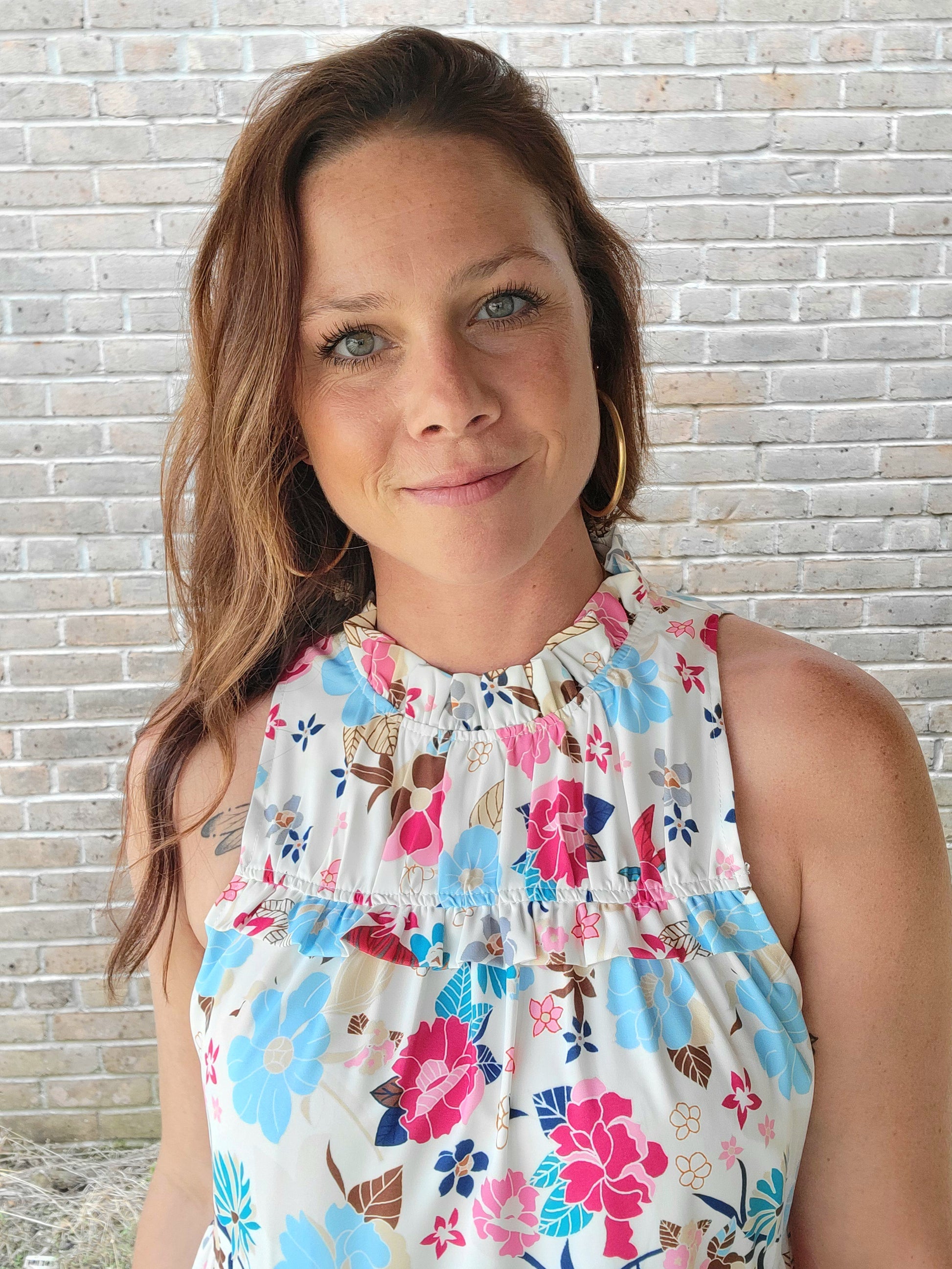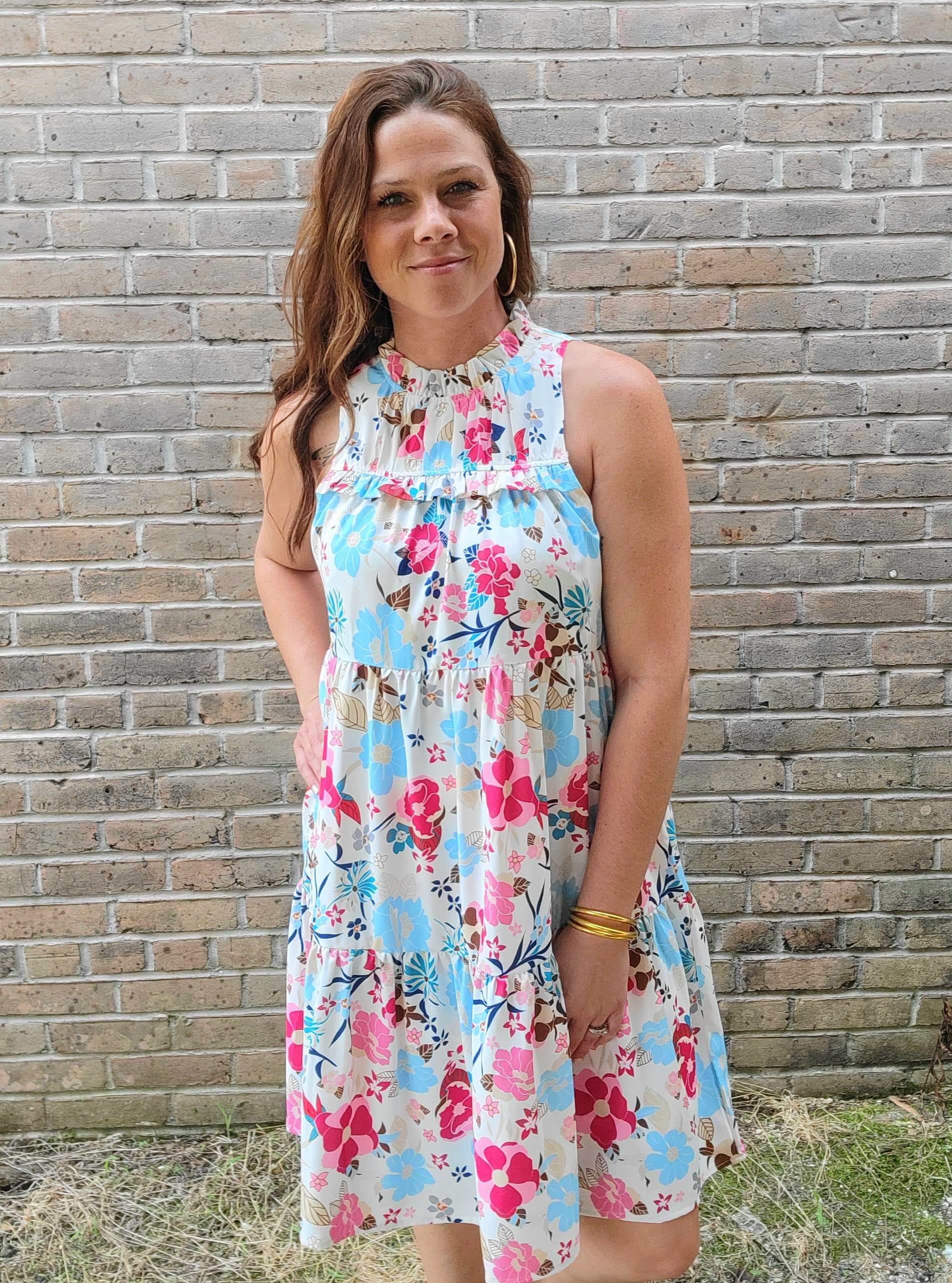 Embrace your playful side with the Dolly Dress! This halter neck dress features tiered ruffle detail and a vibrant floral design, perfect for adding a fun pop of color to any outfit. Get ready to turn heads and have some fun in this quirky and stylish dress!
