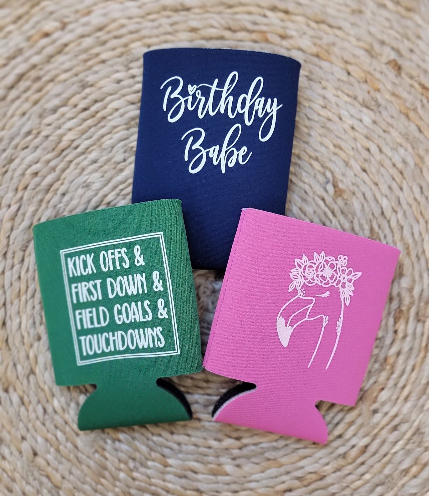 Don't let your drinks get lonely! Our Drink Huggers have three fun designs, including Flamingo, Birthday Babe, and Football Season! Keep your drinks safe, and you’ll never cry over a spilled drink again!