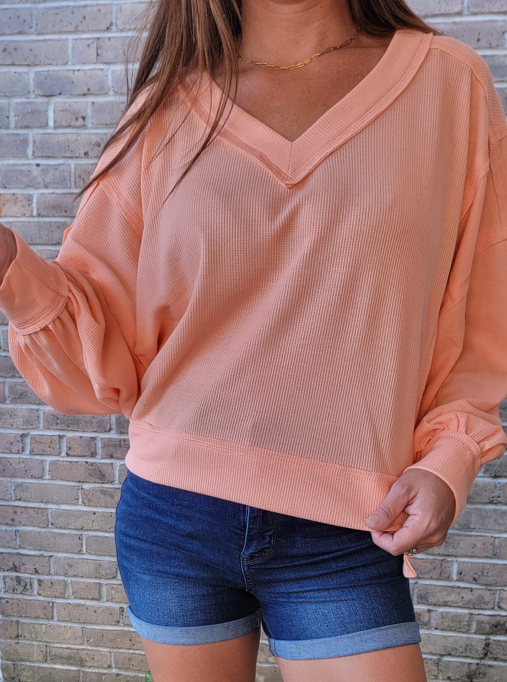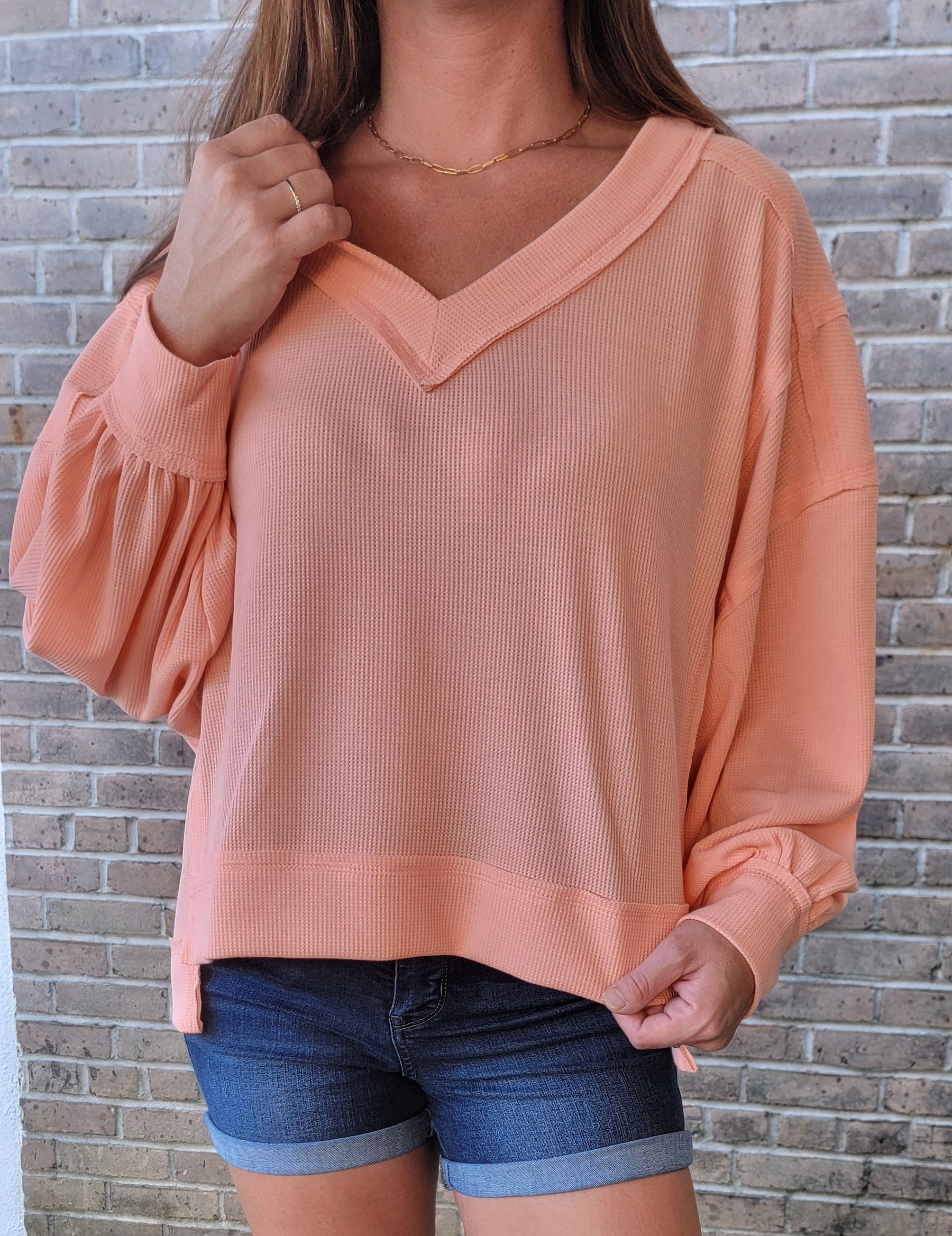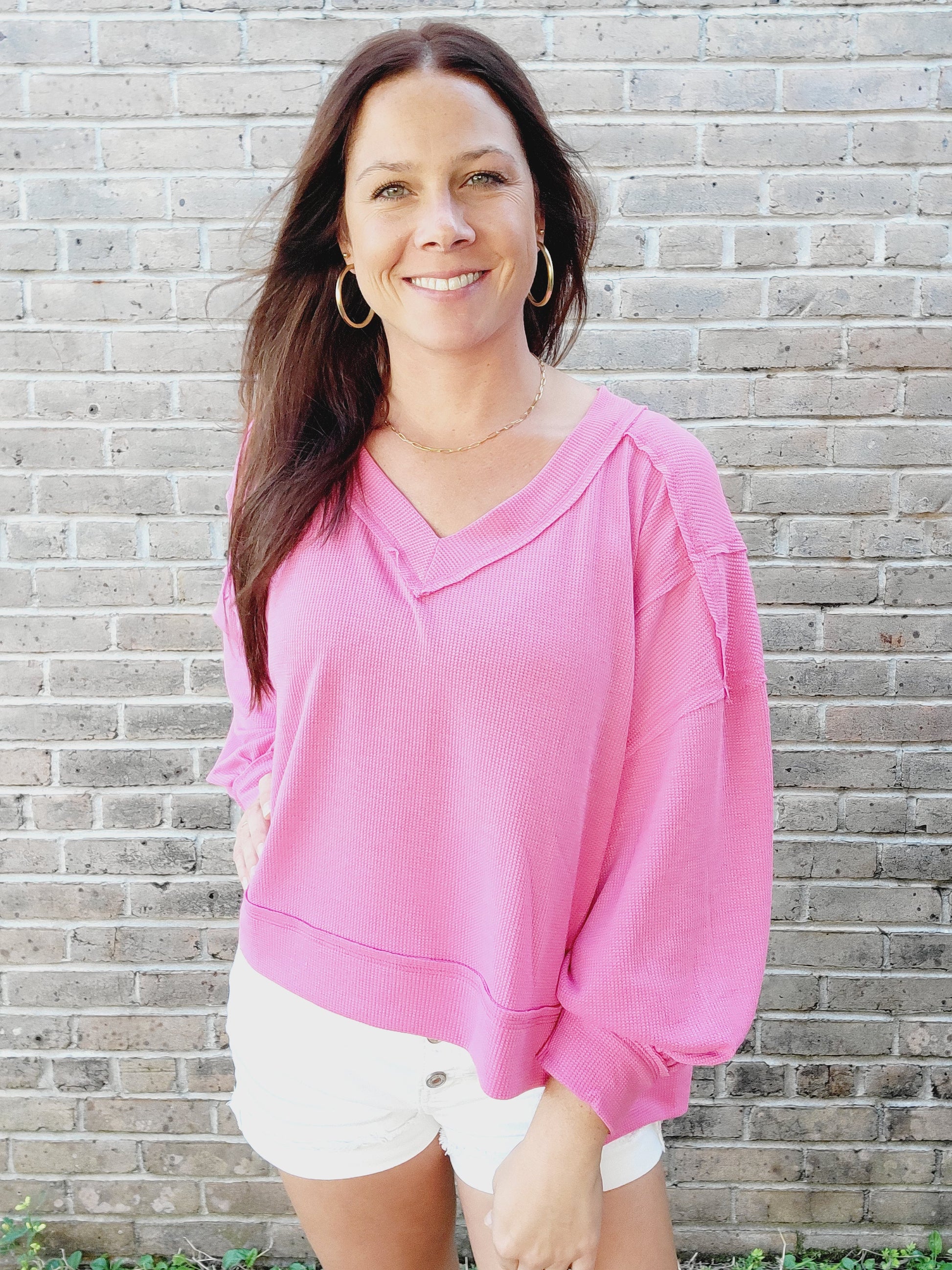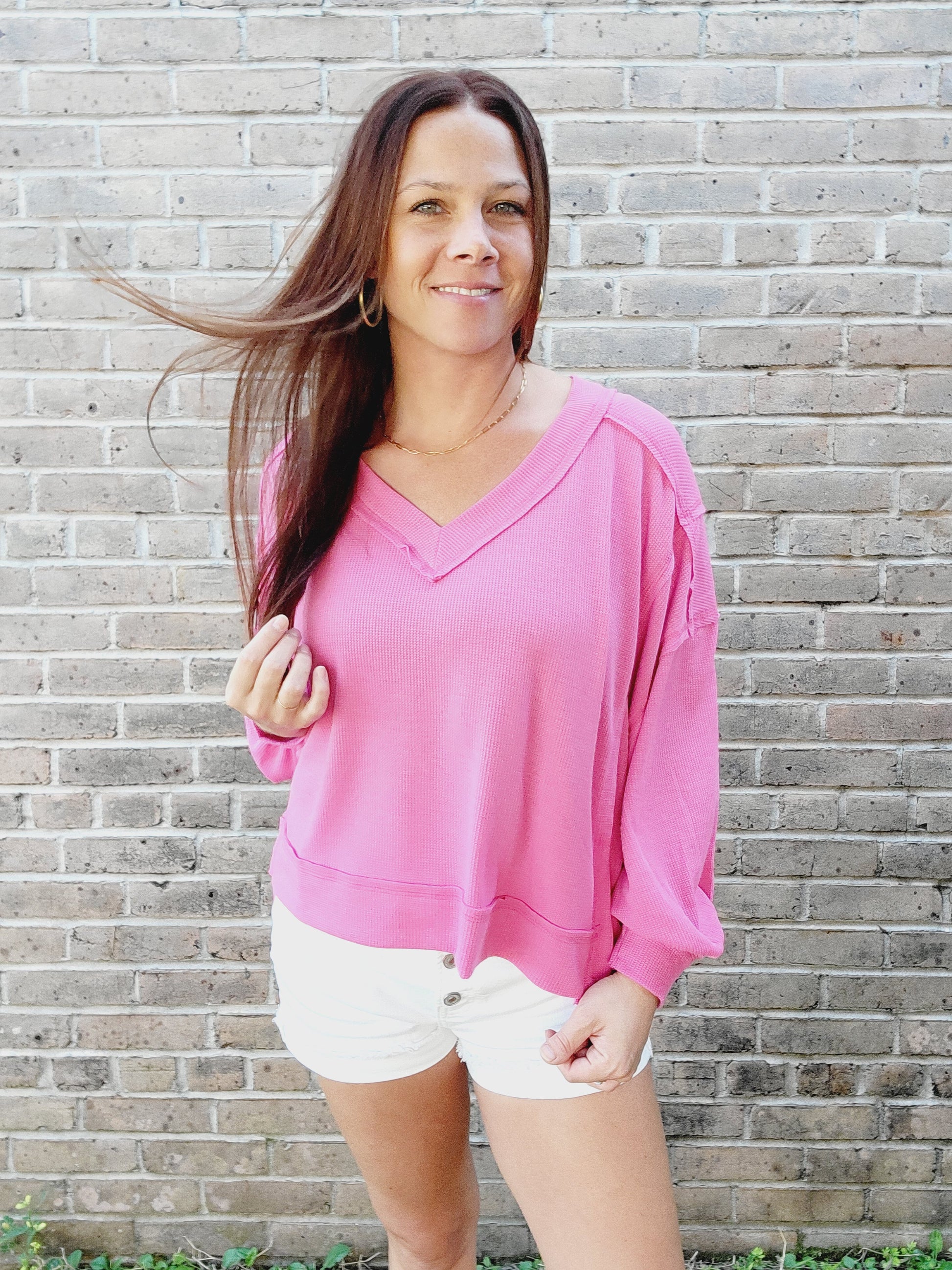 Lighten up your wardrobe with the Fara Knit Top! This lightweight top features a trendy hi-low style and oversized fit, perfect for a casual day out. The cuffed sleeves and exposed seams add unique details to this classic V-neck top. We can't get enough of this cutie!