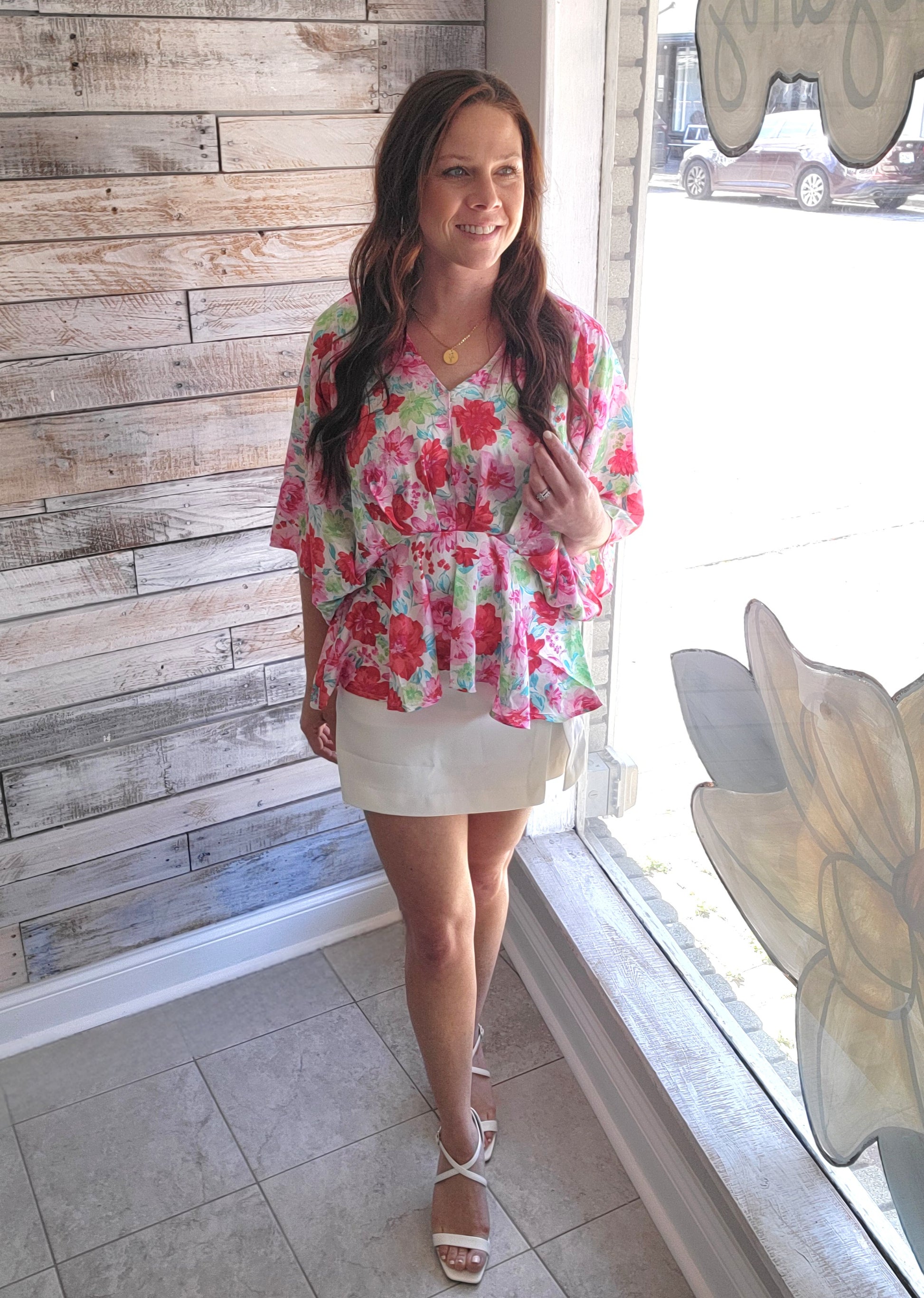 Get ready to bloom in style with our Floral Flutter Sleeve Top! With its bright floral design, this top is perfect for spring and summer. The flowy fit adds a touch of femininity and makes it a must-have for your wardrobe. Don't miss out on this stylish and playful top! Fit is true to size. 100% Polyester.