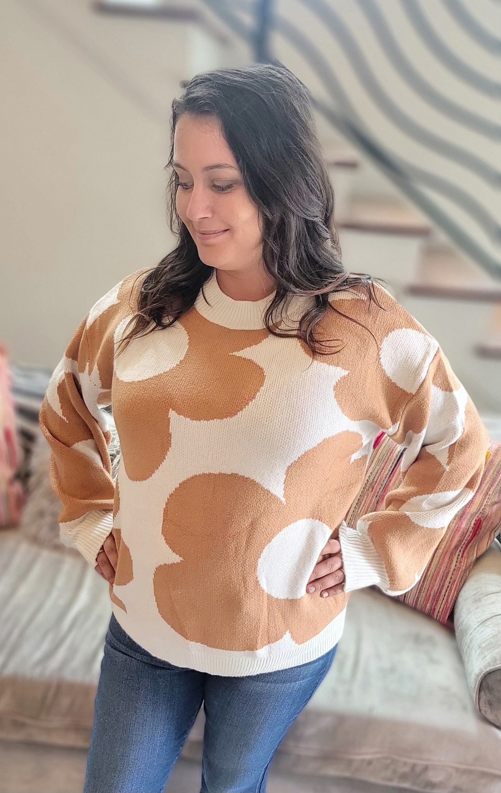 Get cozy and stylish with our Floral Pullover! This pullover features a large and eye-catching floral print, adding a touch of whimsy to any outfit. Made with incredibly soft material, you'll never want to take it off. Don't miss the ivory and camel details for an extra special touch. Perfect for those who love comfort and style!