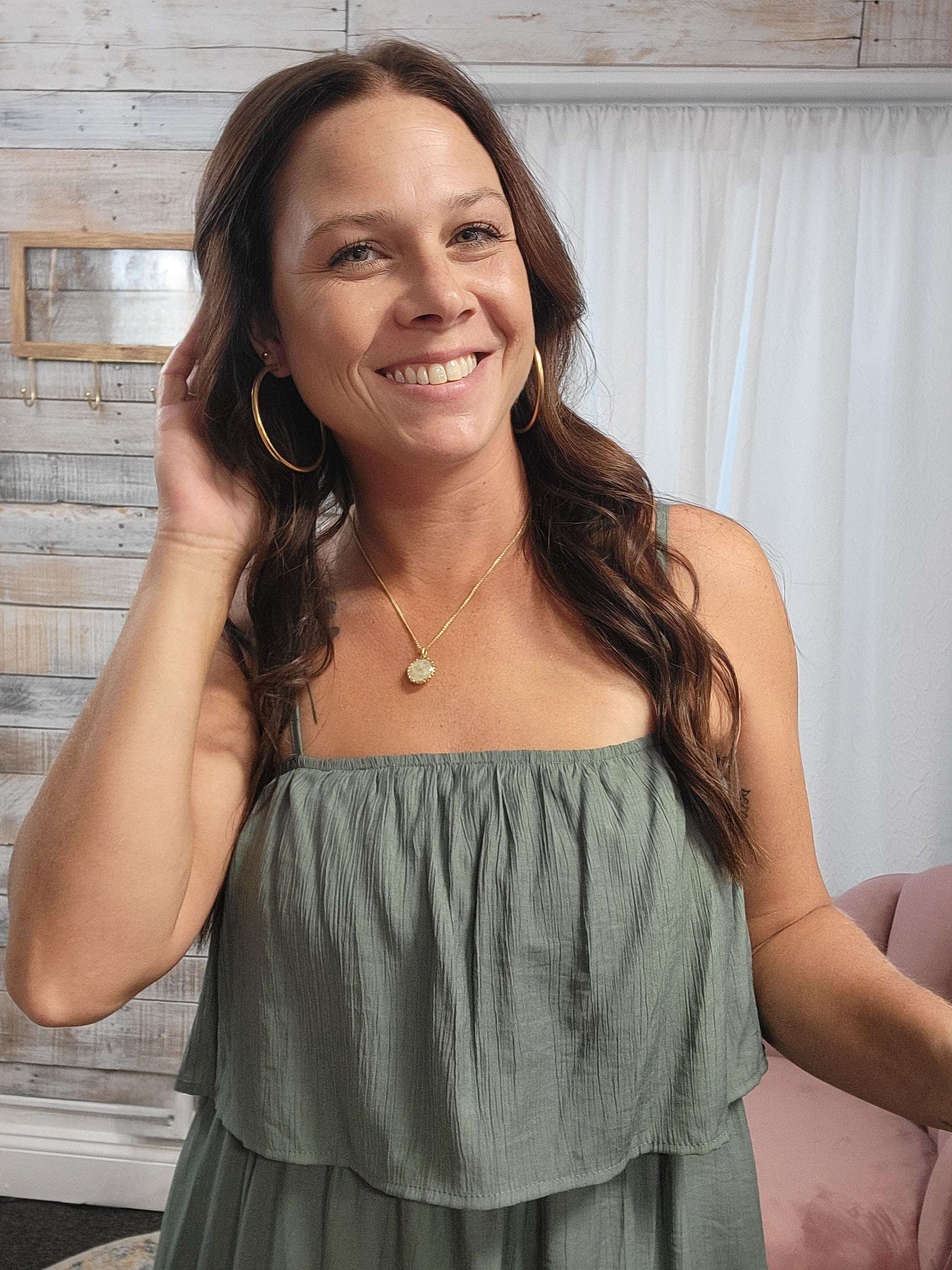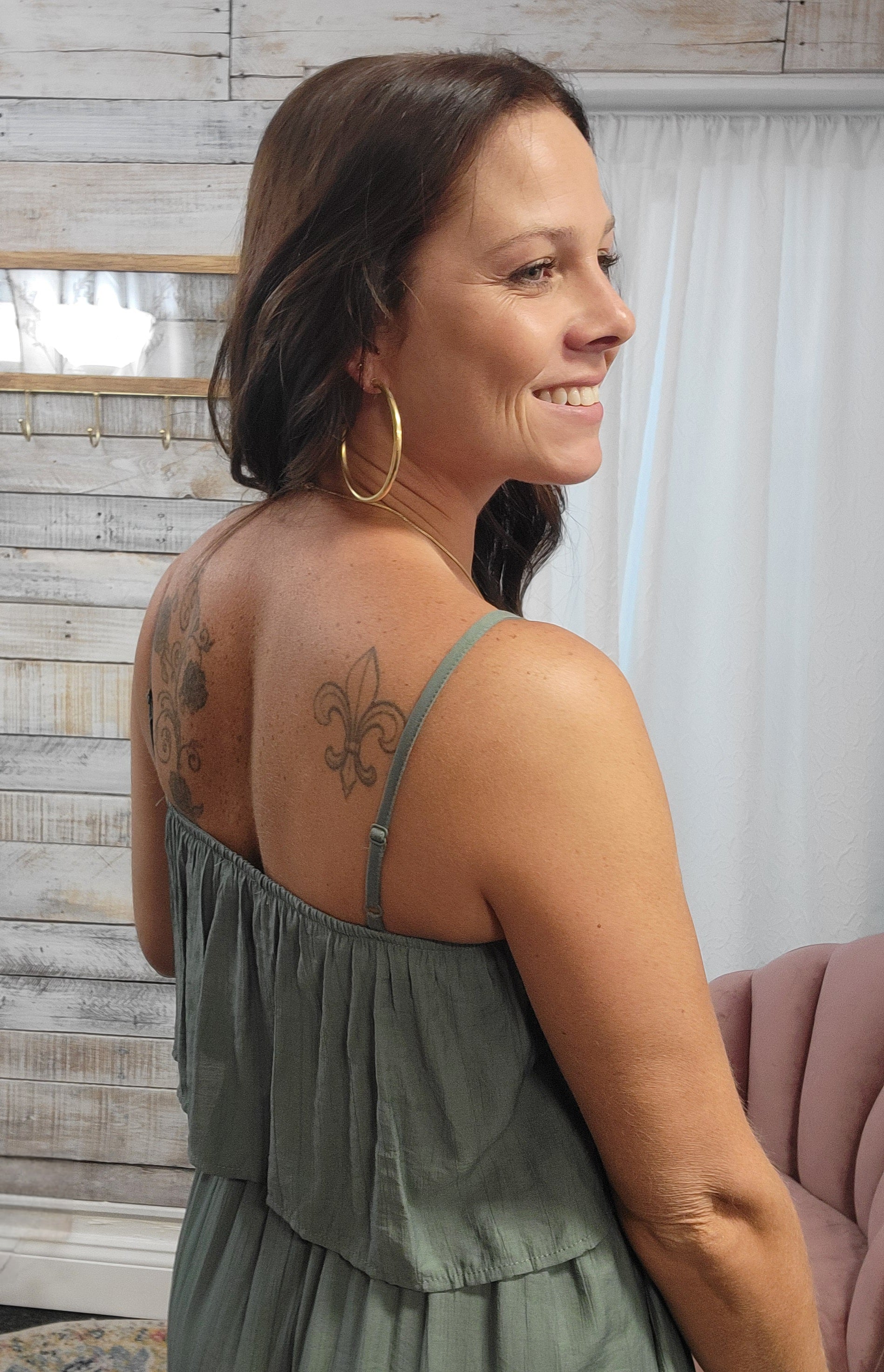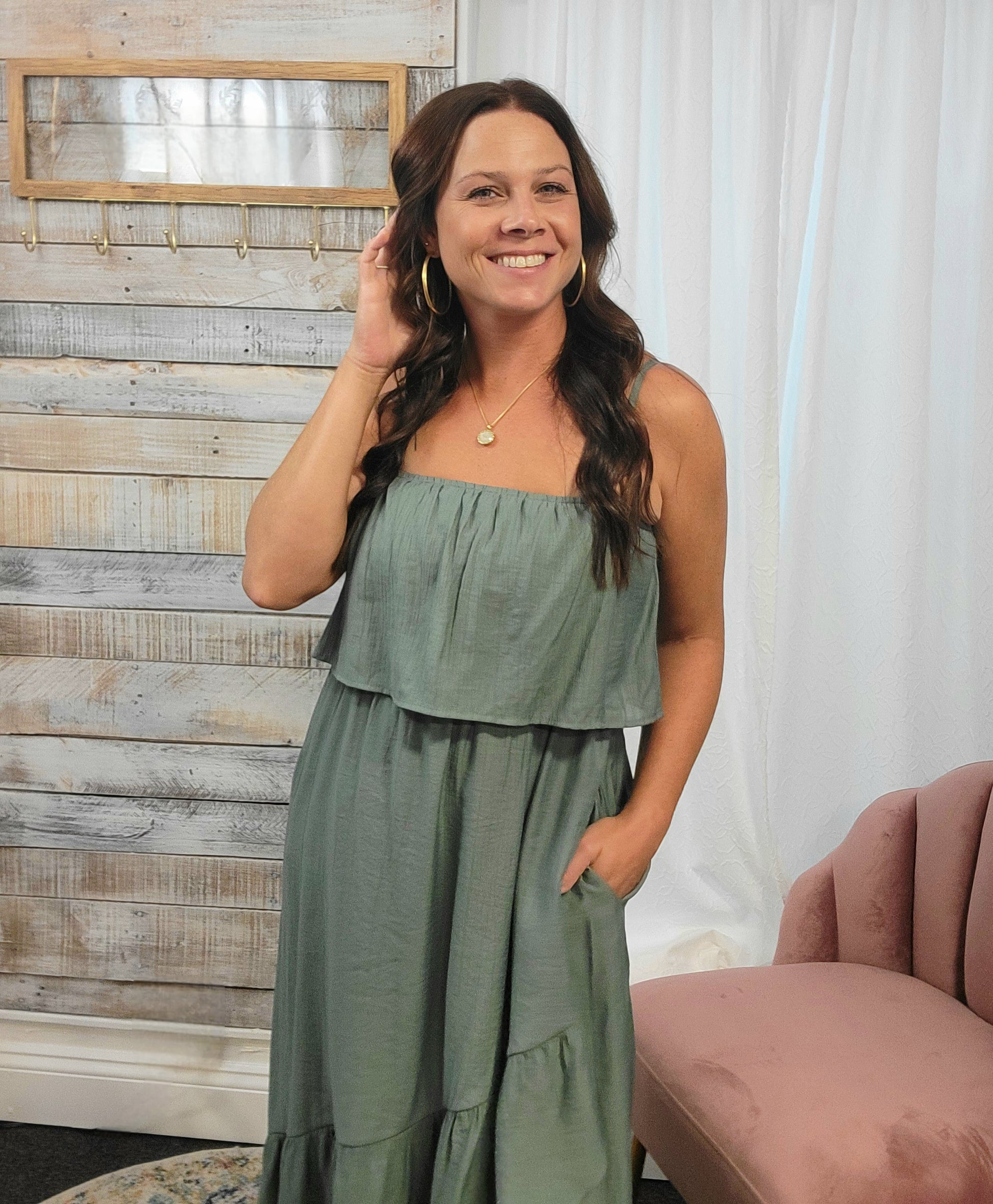 The Gena Dress, in a luxurious sage hue, boasts a hi-low design and strapless silhouette. Its light and flowy fabric effortlessly drapes along the body, exuding elegance and sophistication. A must-have for any special occasion.