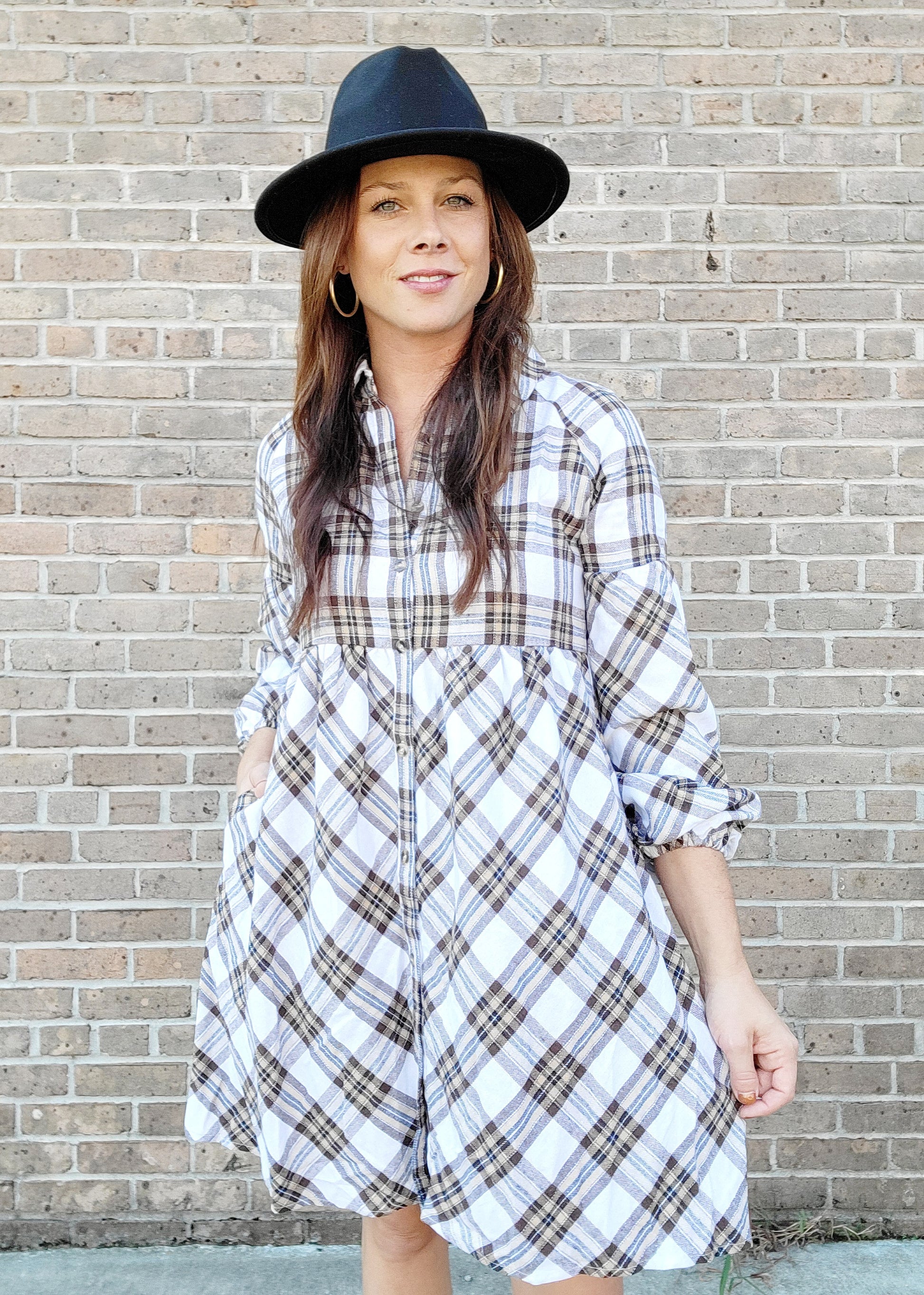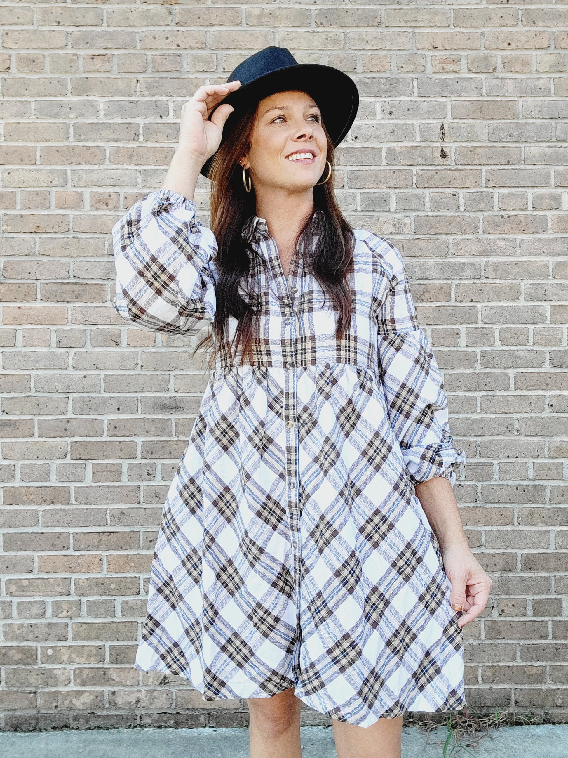 Indulge in sophistication with our Hey Darlin' Dress! This luxurious design features a striking brown, black, and ivory plaid print, complemented by elegant bubble sleeves and elastic wrist bands. The dress also boasts the convenience of pockets, making it both stylish and functional. Elevate your wardrobe with this exclusive piece!