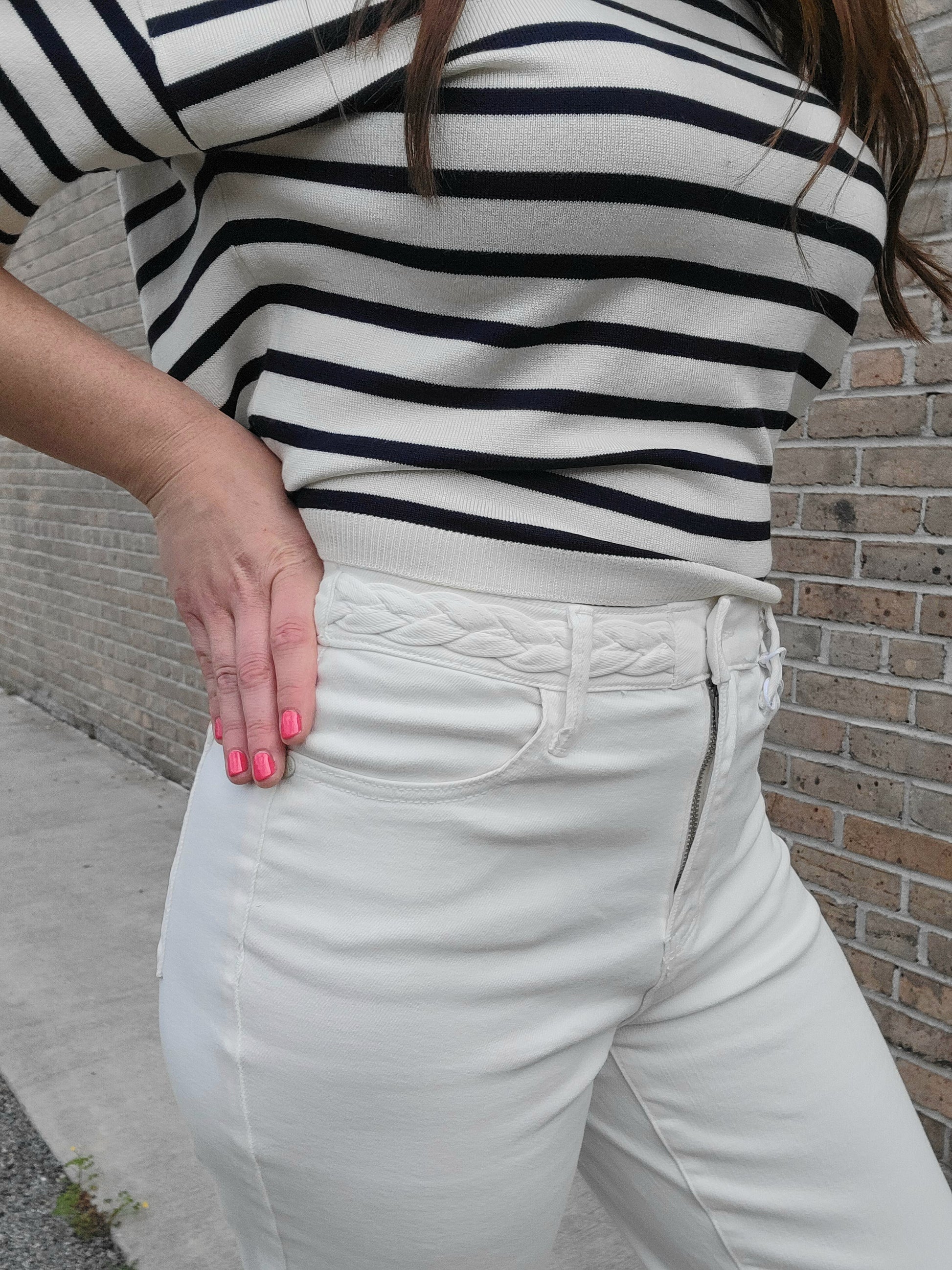 Look effortlessly cool in these Judy Blue Carla Jeans! The wide leg and braid detail add a unique touch to the classic white design. Perfect for any occasion, these jeans are both fun and stylish.
