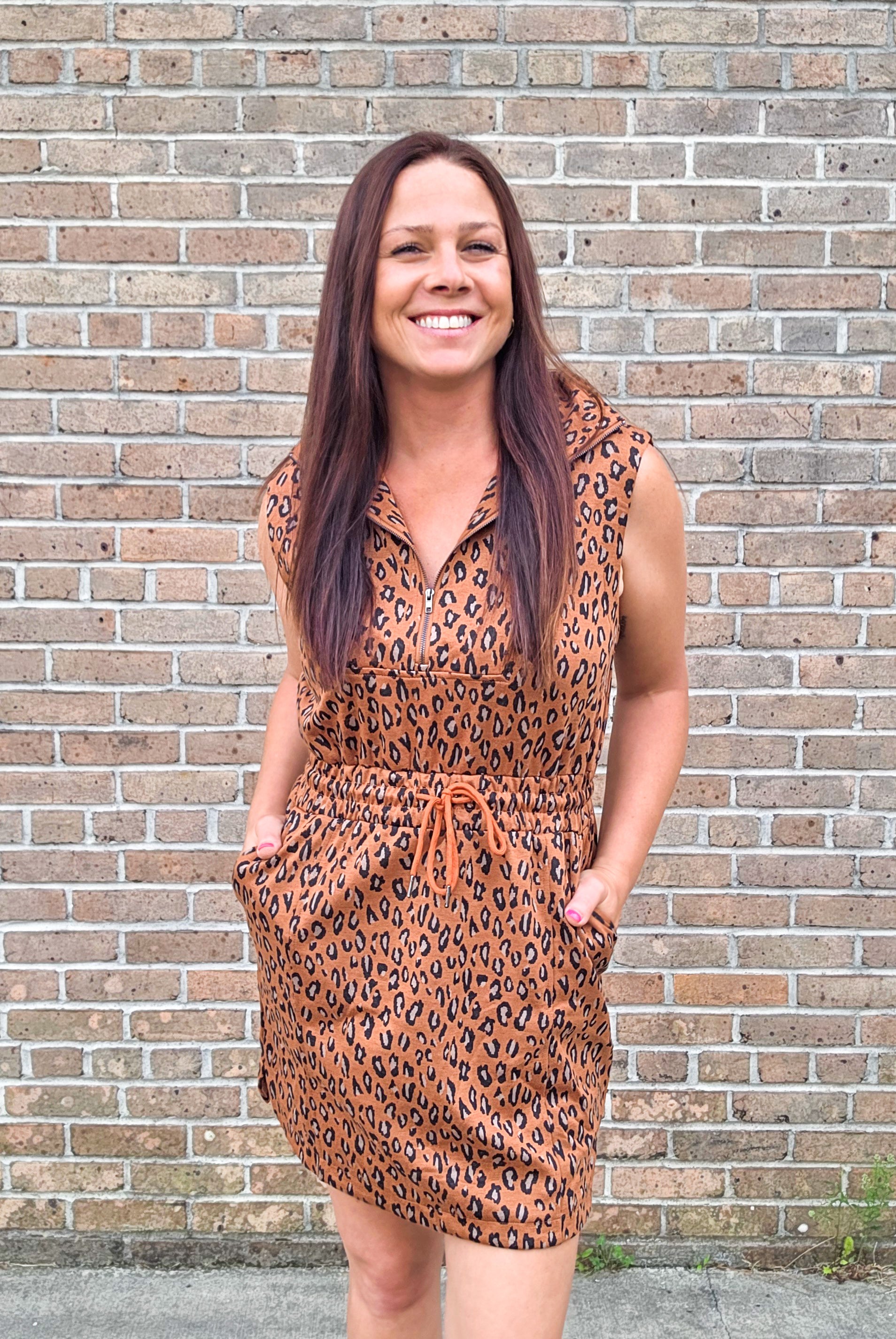 Add a touch of fierce sophistication to your wardrobe with our Leopard Chic Dress! Featuring a half zip, pockets, and a stylish elastic waistband with functioning drawstring, this dress is both chic and practical. Roar with style in our Leopard Chic Dress!