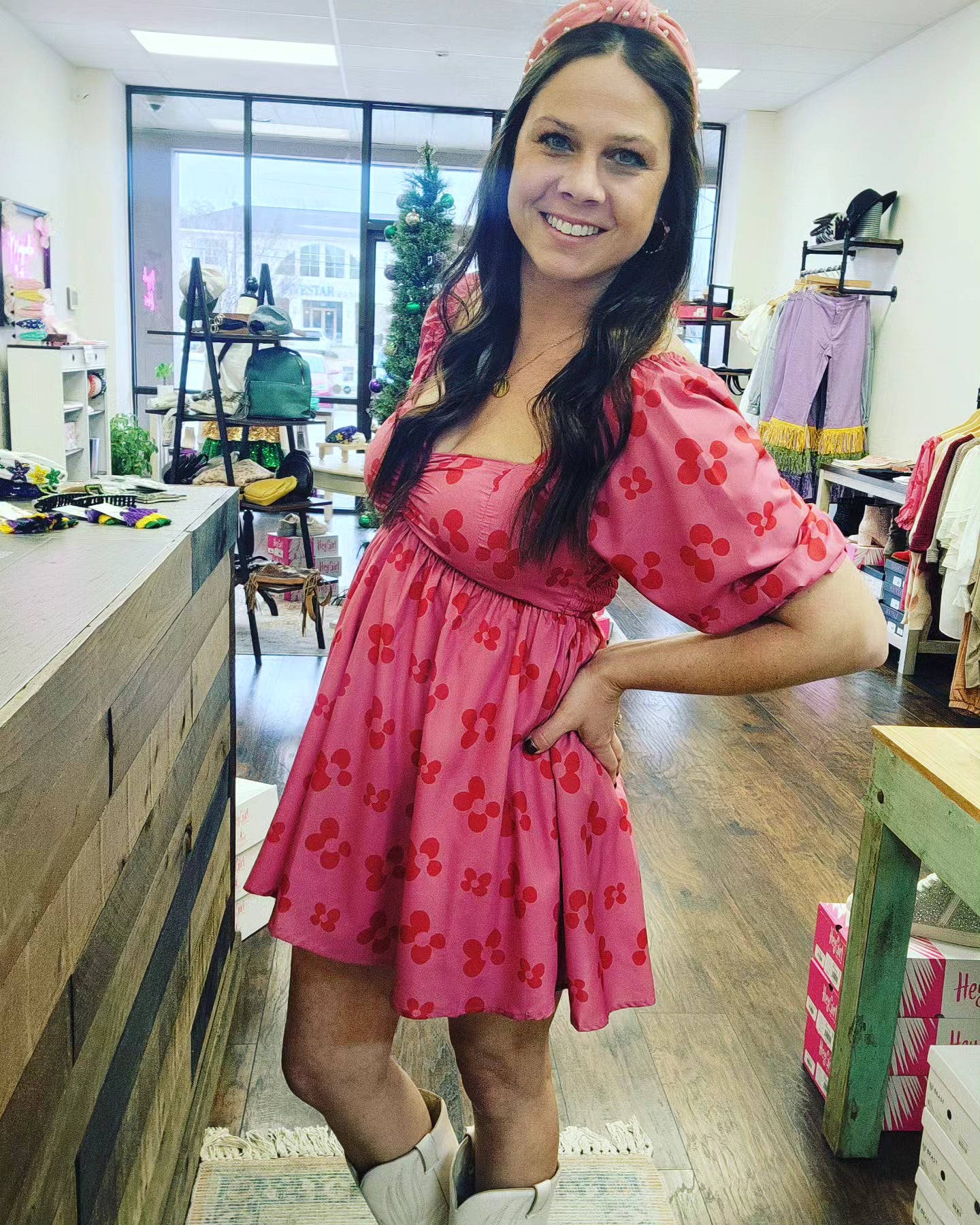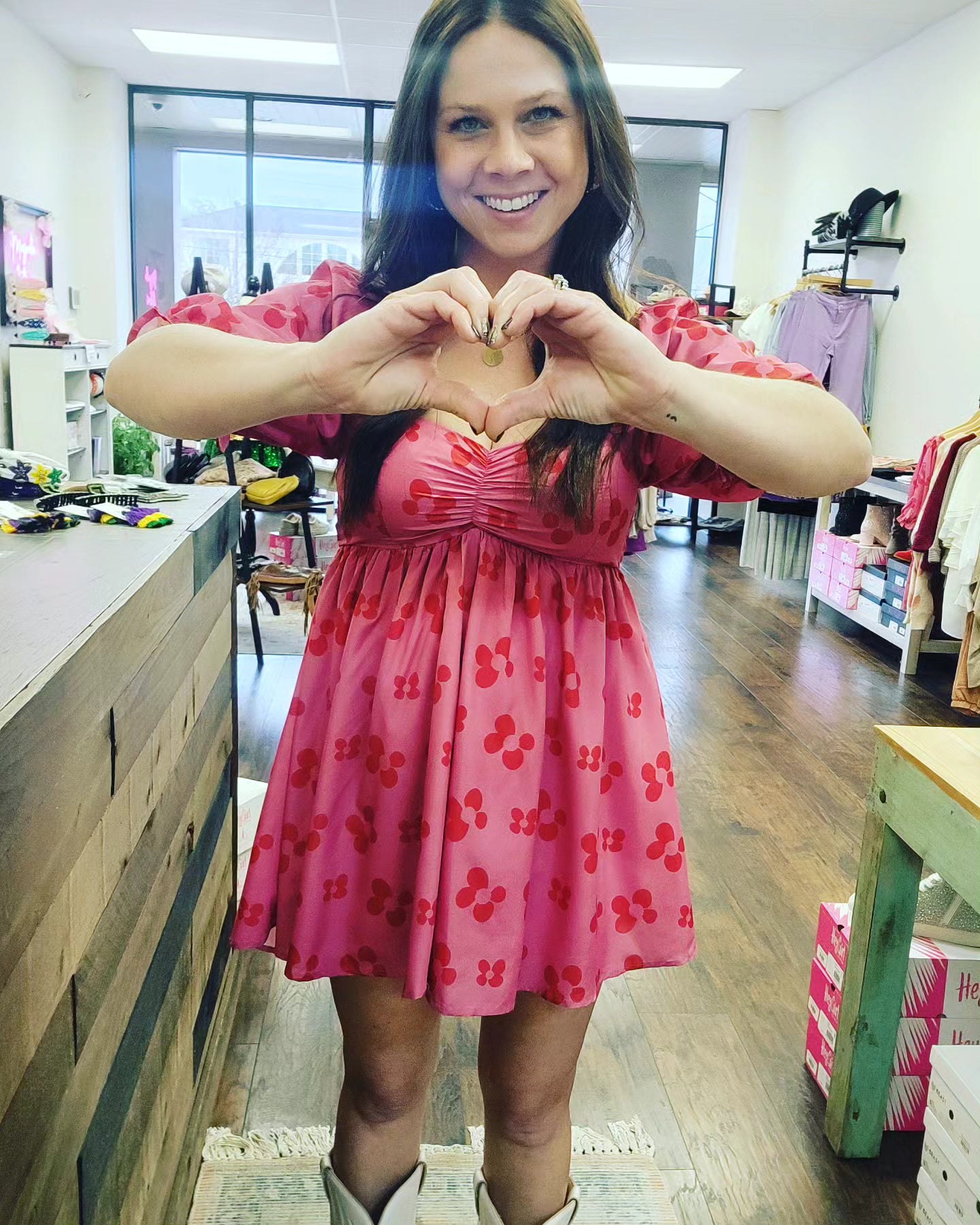 Get ready to be the cutest babe on the block with our Rouched Baby Doll Romper! This pink romper features adorable red floral details and puff sleeves, making it perfect for any occasion. You'll be turning heads and melting hearts in this playful and oh-so-cute outfit! Fit is true to size! 100% Polyester. Lined.