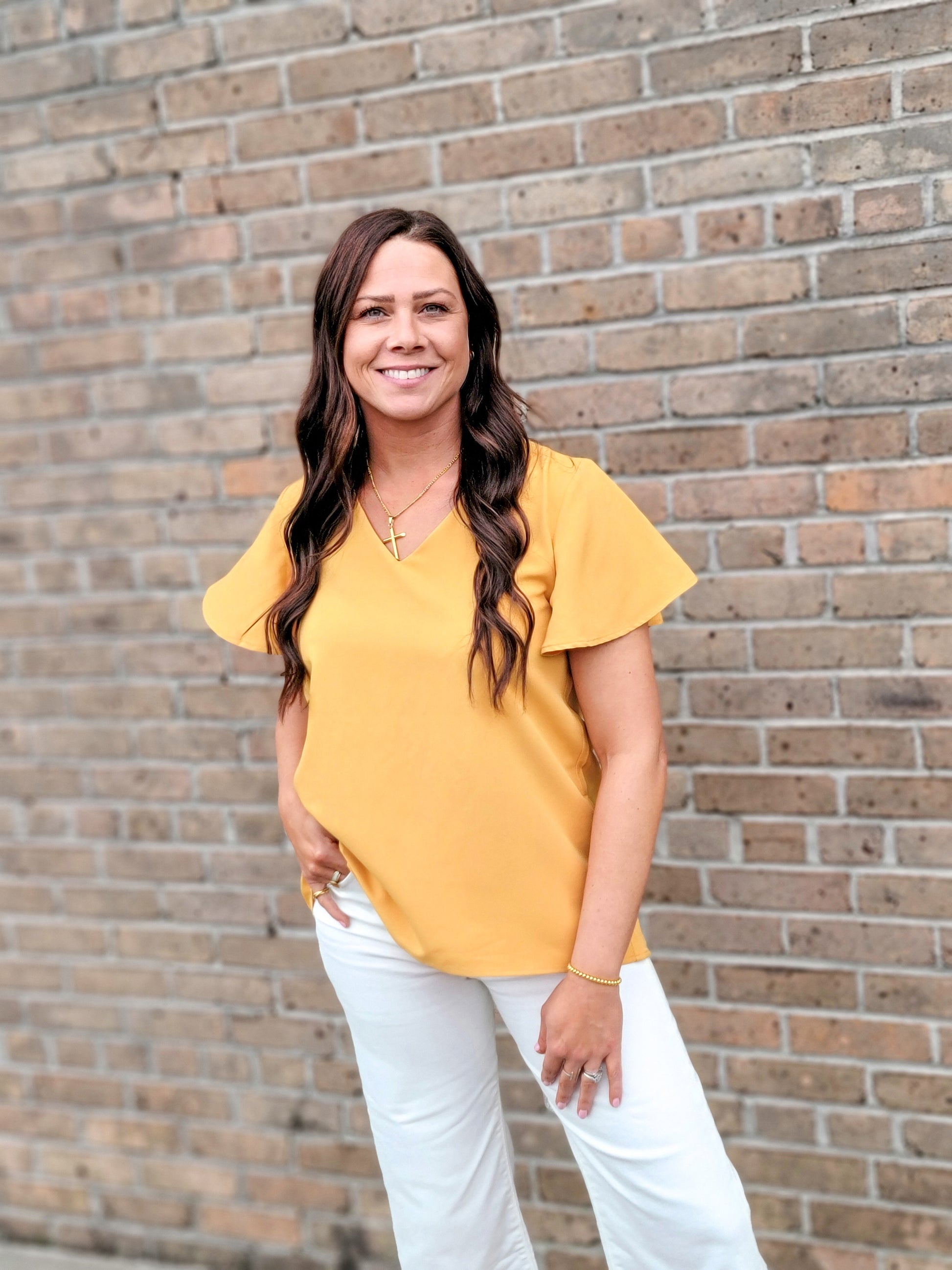 Introducing our Sunflower Fields Top - the perfect addition to your wardrobe! With its golden mustard color, this top is not only pretty but also versatile. Whether you're dressing for Spring, Summer, or Fall, the v-neck and flutter sleeve will add a playful touch to any outfit.