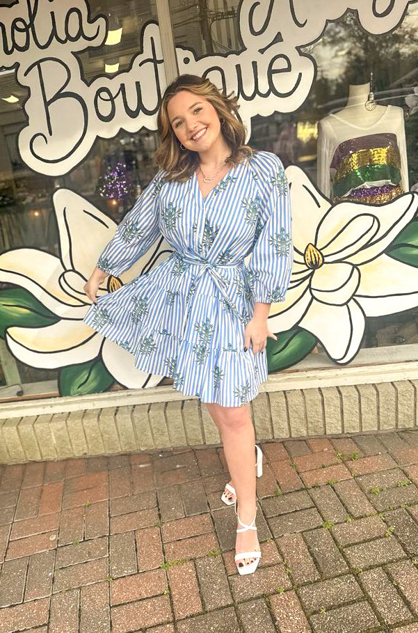 This dress is a perfect blend of stripes and florals, with a subtle floral detail that adds a touch of elegance. The waist tie not only adds a flattering silhouette, but also adds a practical element with pockets for convenience. Look effortlessly stylish in this luxe dress! Available in Blue & Pink.