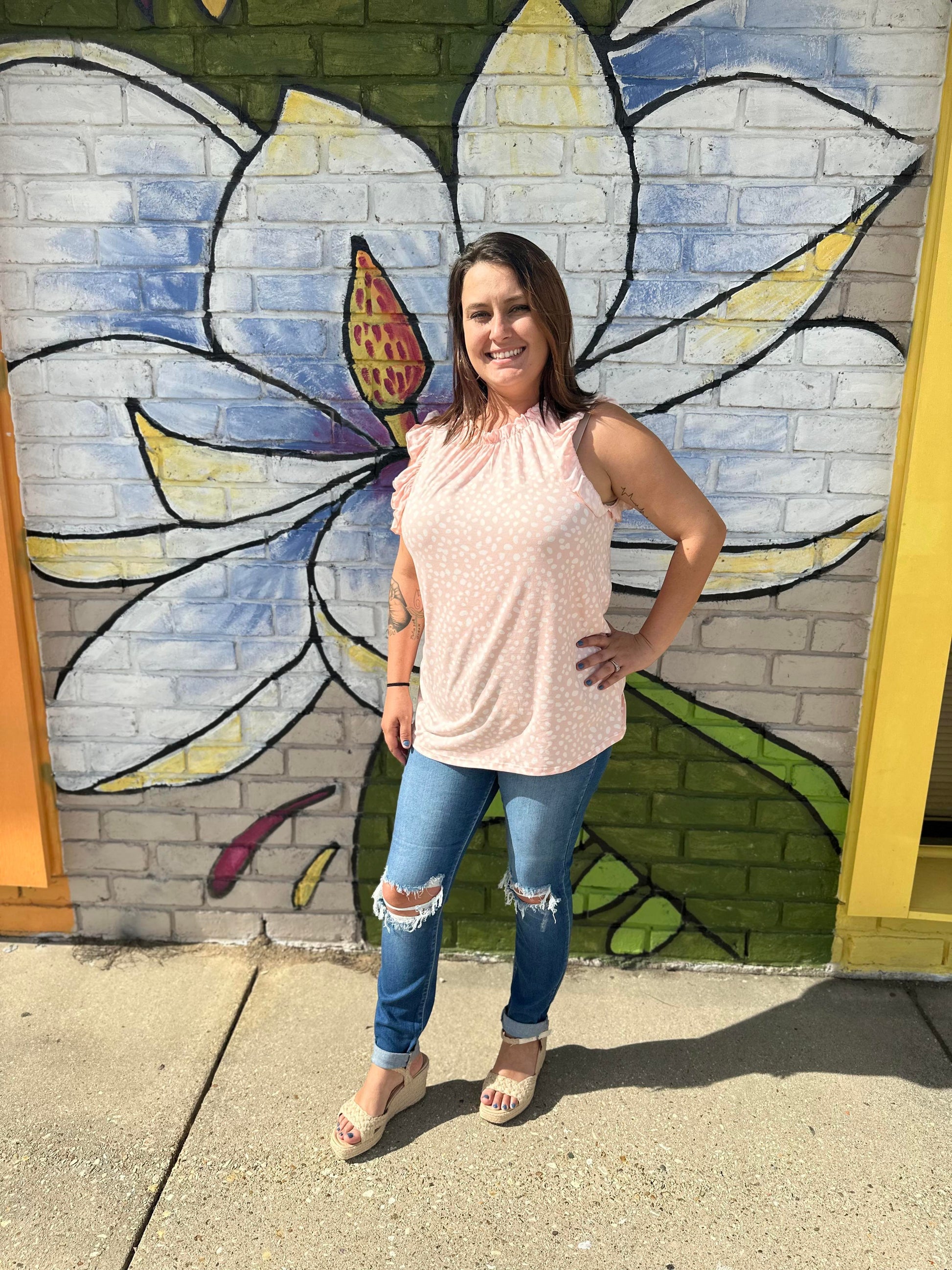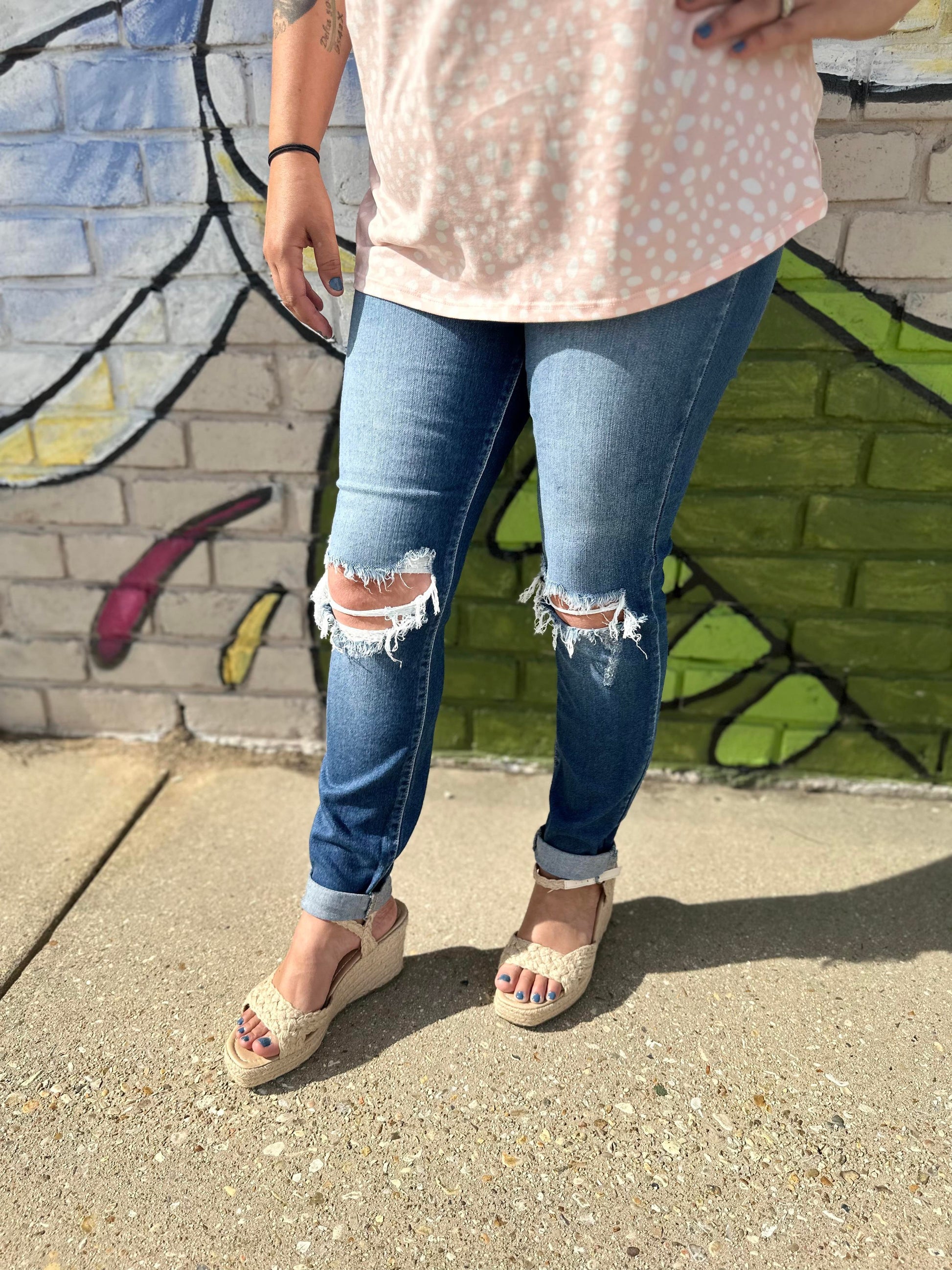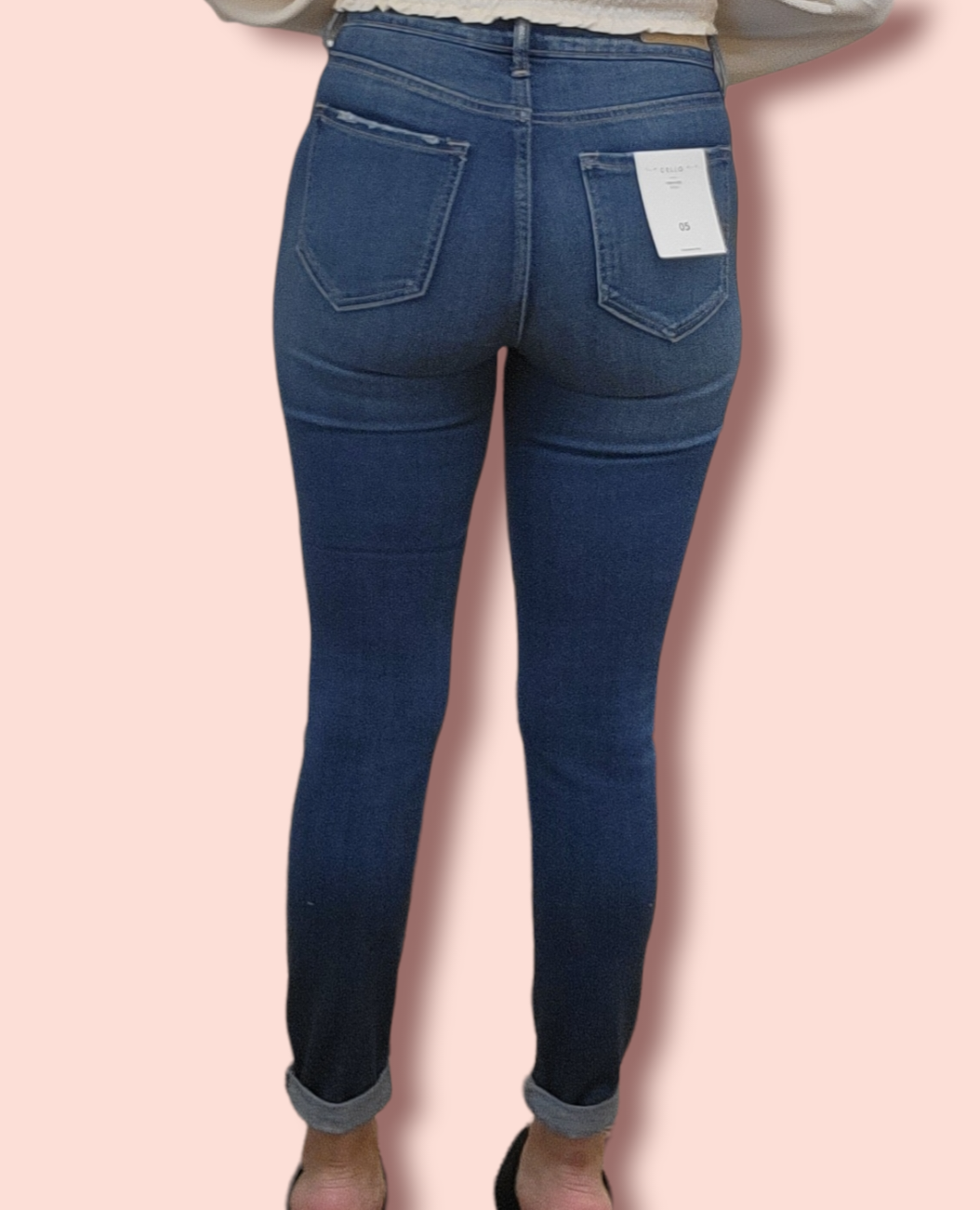 The Holly Jean features a Medium Wash and 11" Rise with Destruction on both knees. Hem comes cuffed but can be uncuffed for our taller friends! Fit is true to size. 41% Cotton, 42% Rayon, 9% Tencel, 6% Polyester, 2% Spandex.