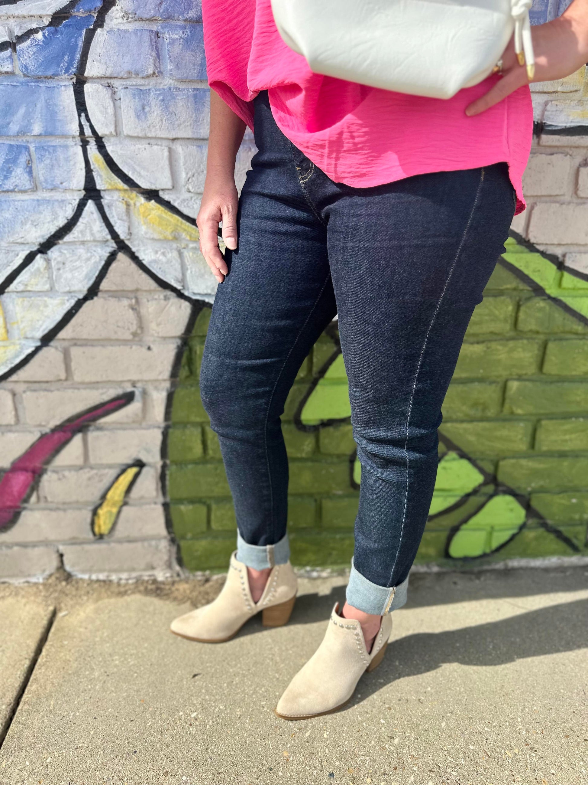 The perfect dark wash skinny jean to complete your Winter ensemble! Dress them up with a cute bootie or tall boot, throw on your favorite top and you are ready for that Holiday party! Recommended to size down 1 size. Available in sizes 3-15. 93% Cotton, 6% Polyester, 1% Spandex.
