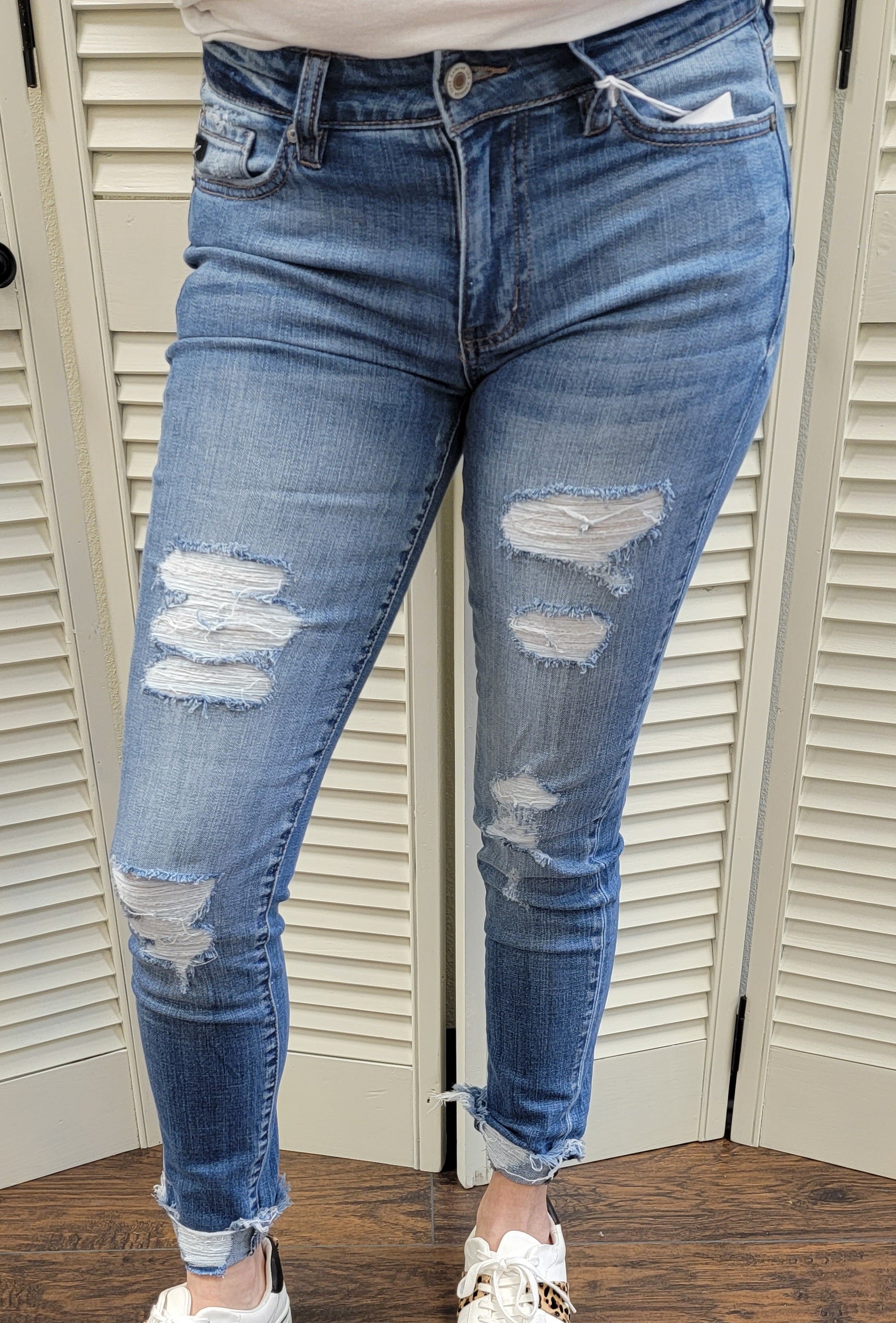 The Taysom Jeans are a medium wash, 8" mid rise skinny jean with opaque destruction throughout. Fit is true to size. 99% Cotton, 1% Spandex.